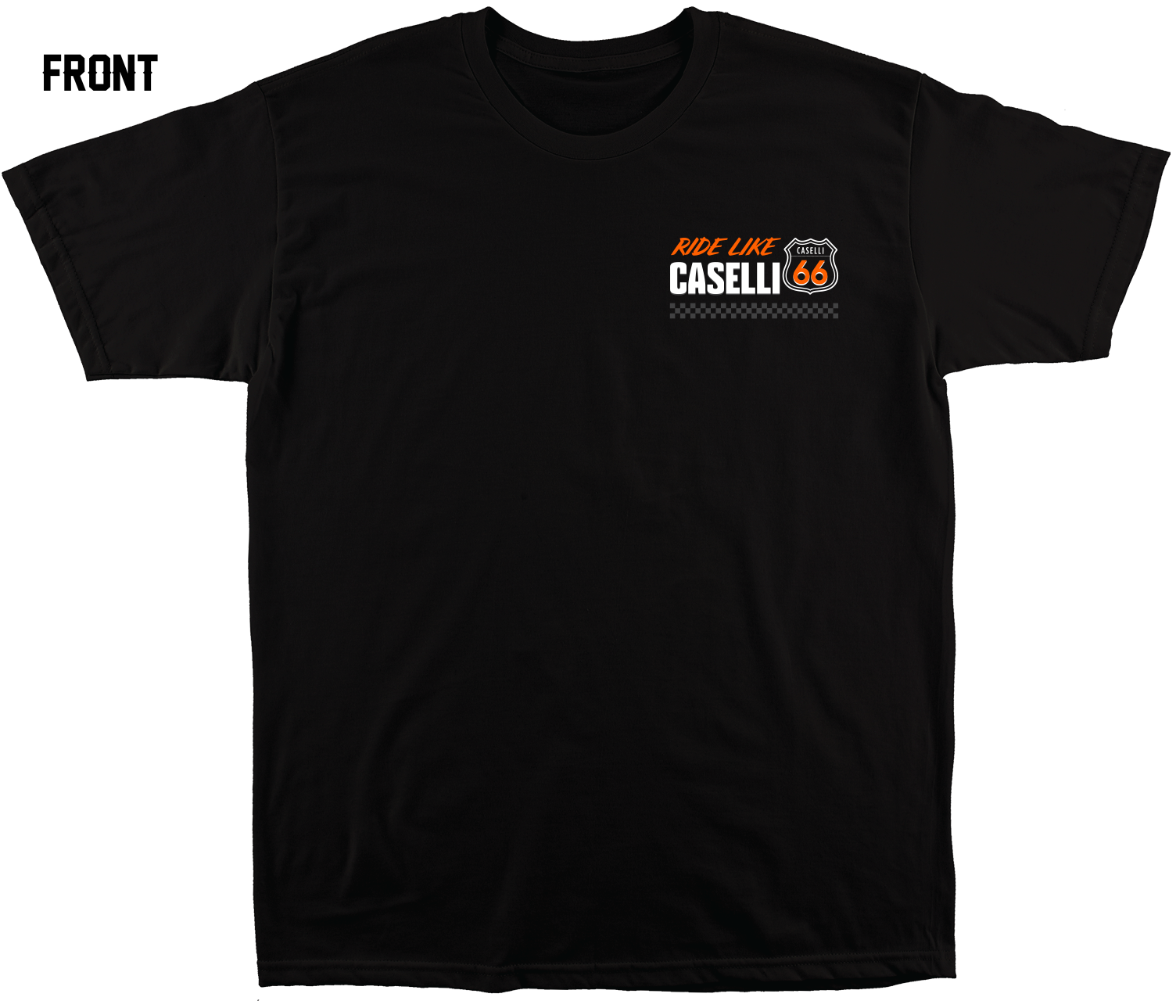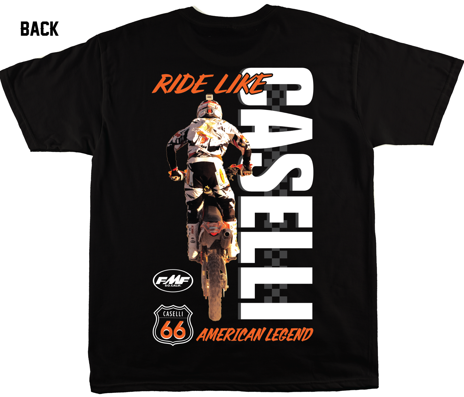 The Forever Tee is a 100% cotton men's tee designed for 2023. It features a bold graphic of Kurt Caselli riding on the back and a small Ride Like Caselli graphic on the front.