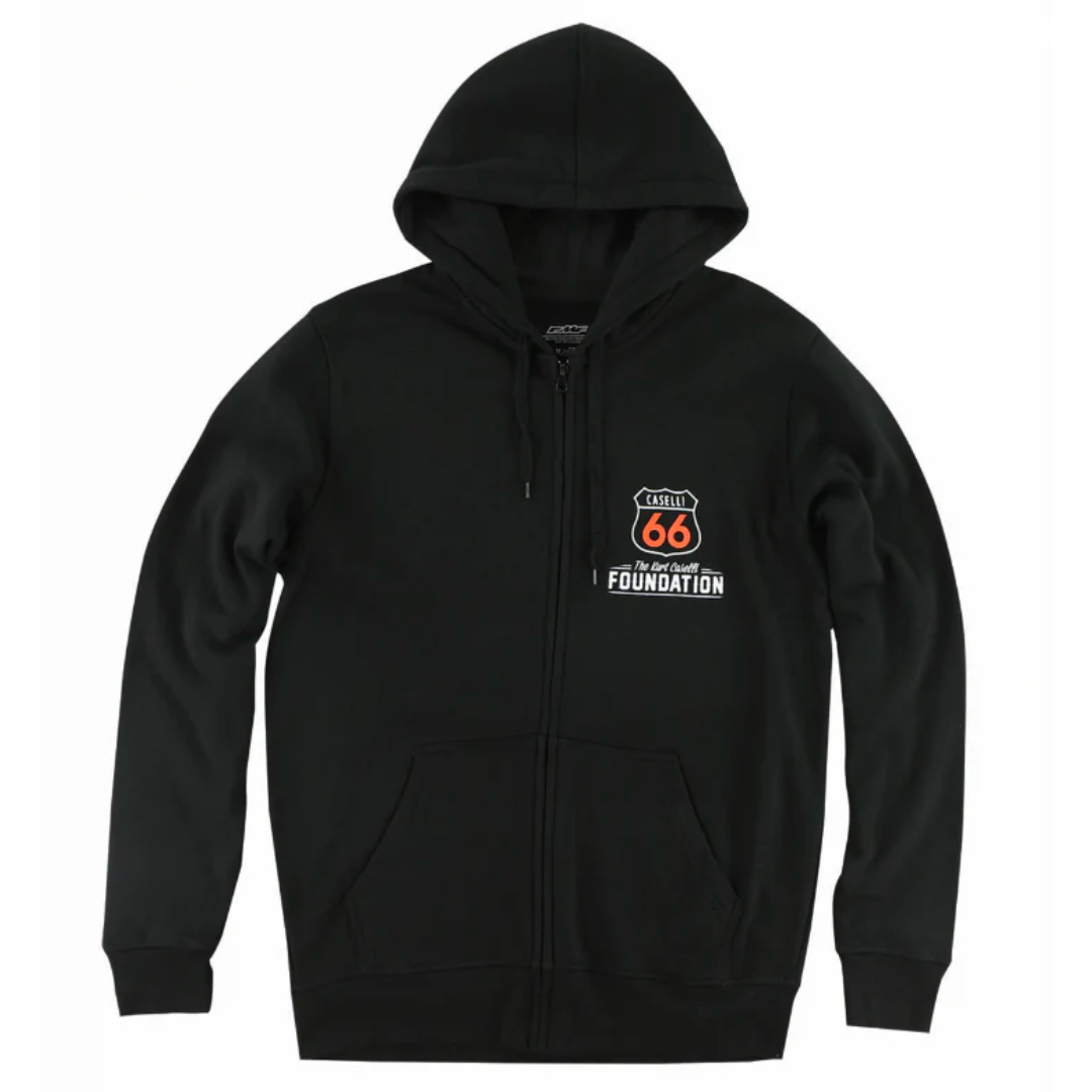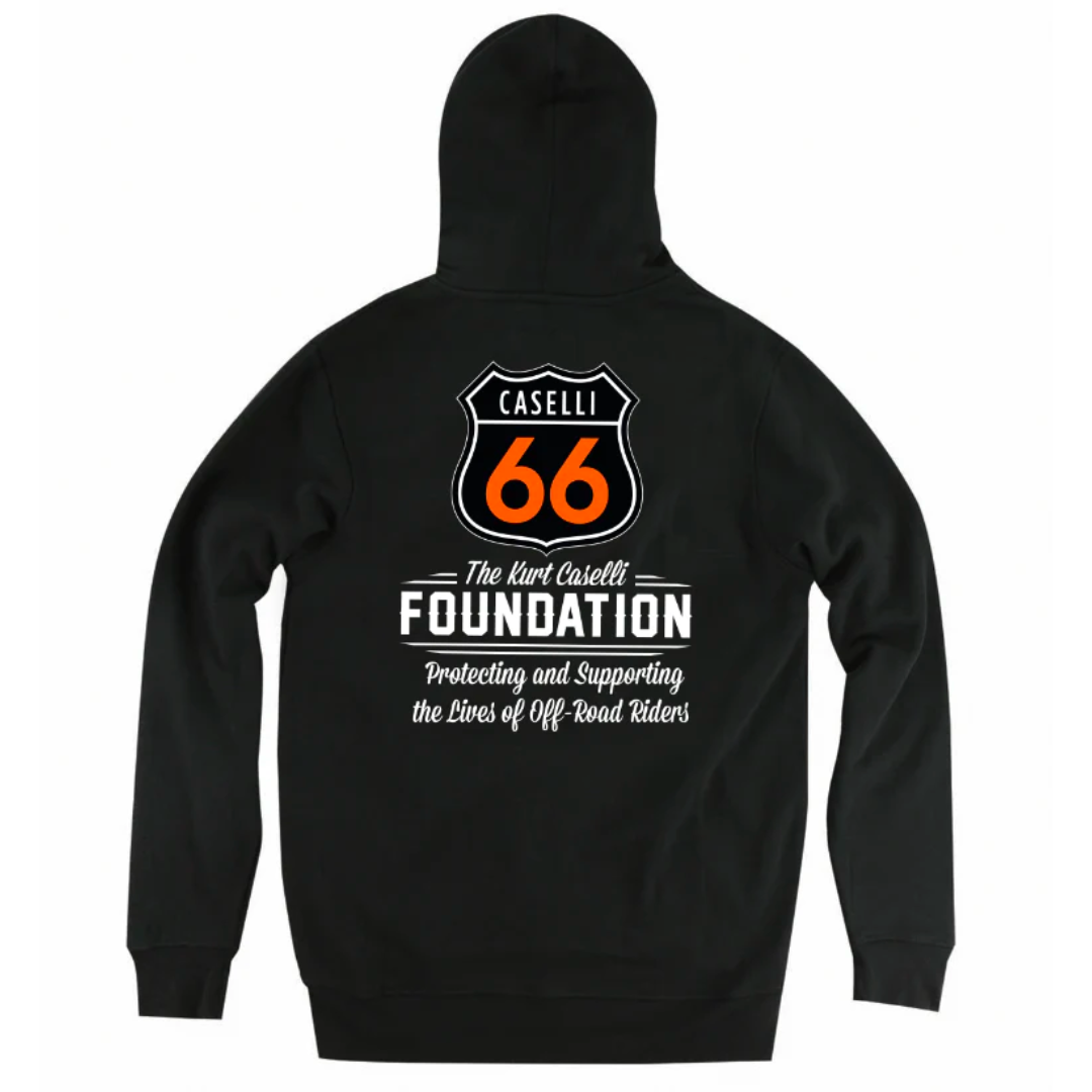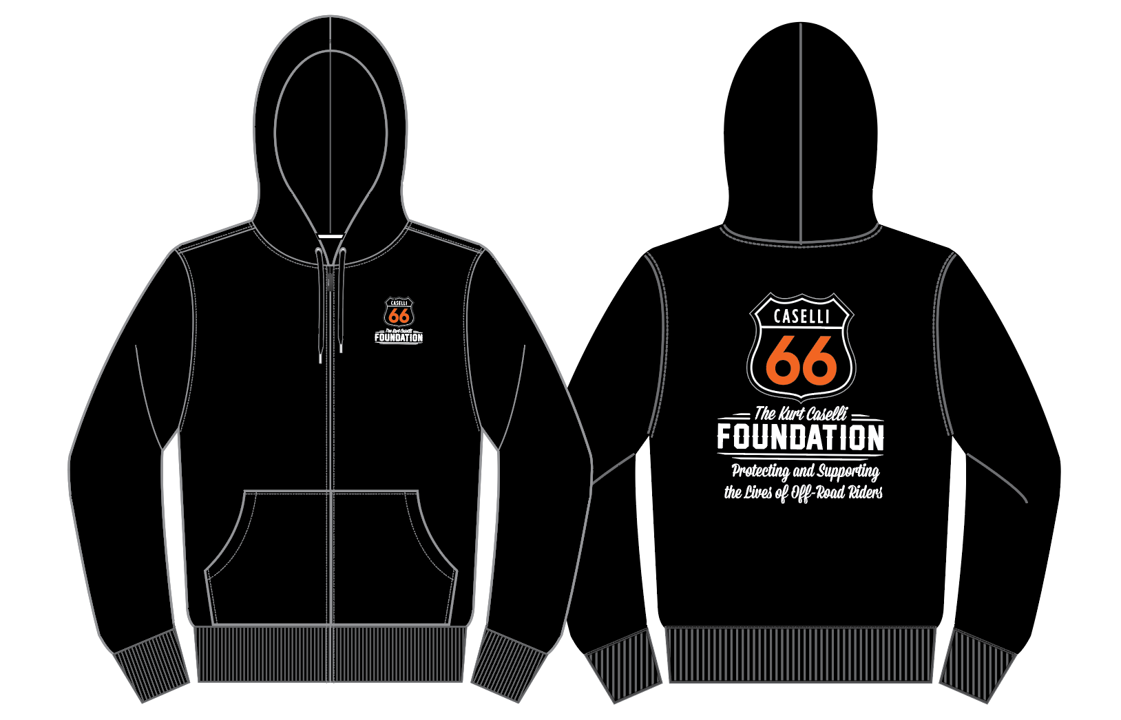 Zip-up hooded sweatshirt with small graphic The Kurt Caselli Foundation logo on front and large back graphic with The Kurt Caselli Foundation logo and mission: Protecting and Supporting the Lives of Off-Road Riders on back. Made of 80% cotton, 20% polyester.