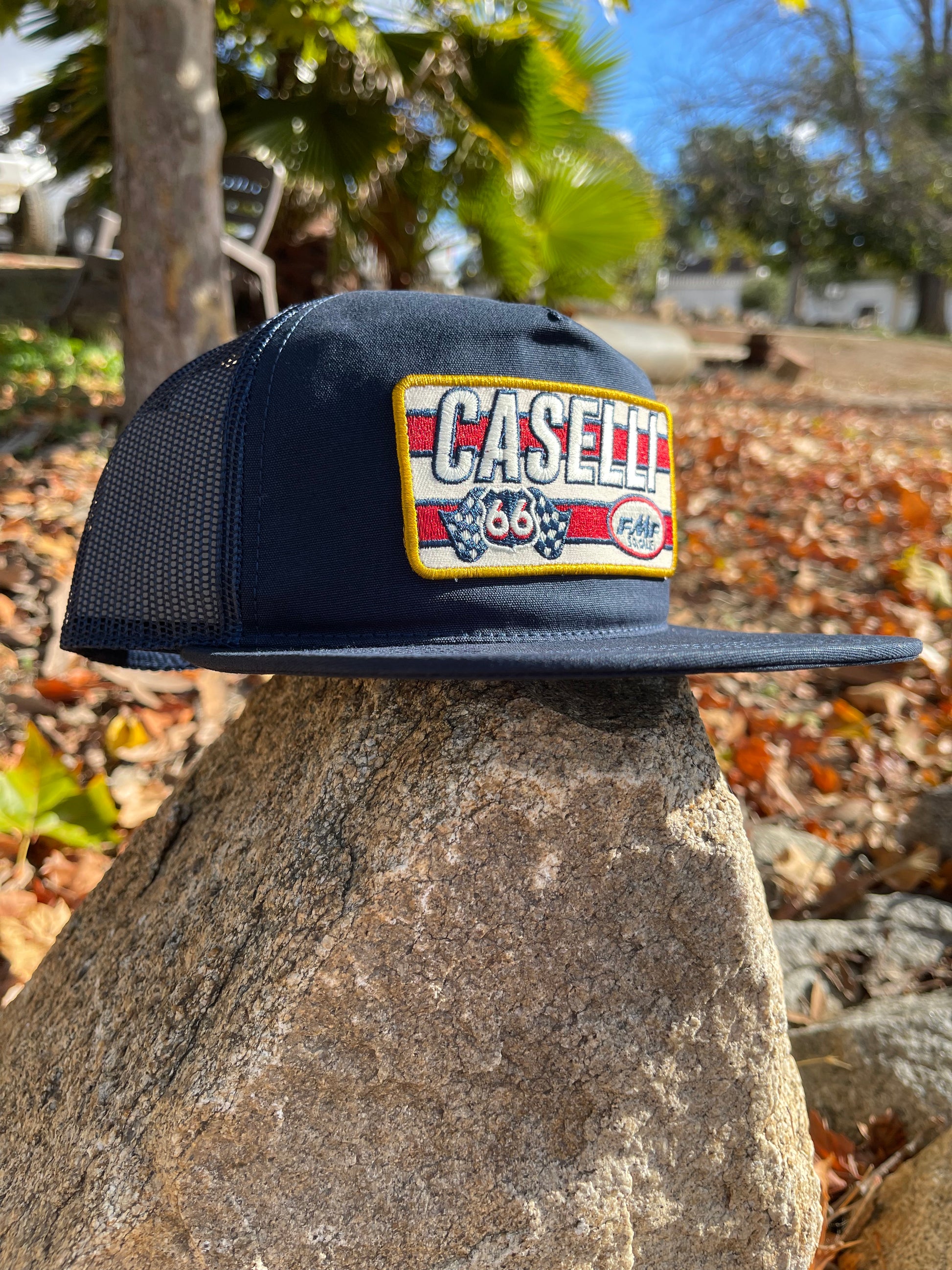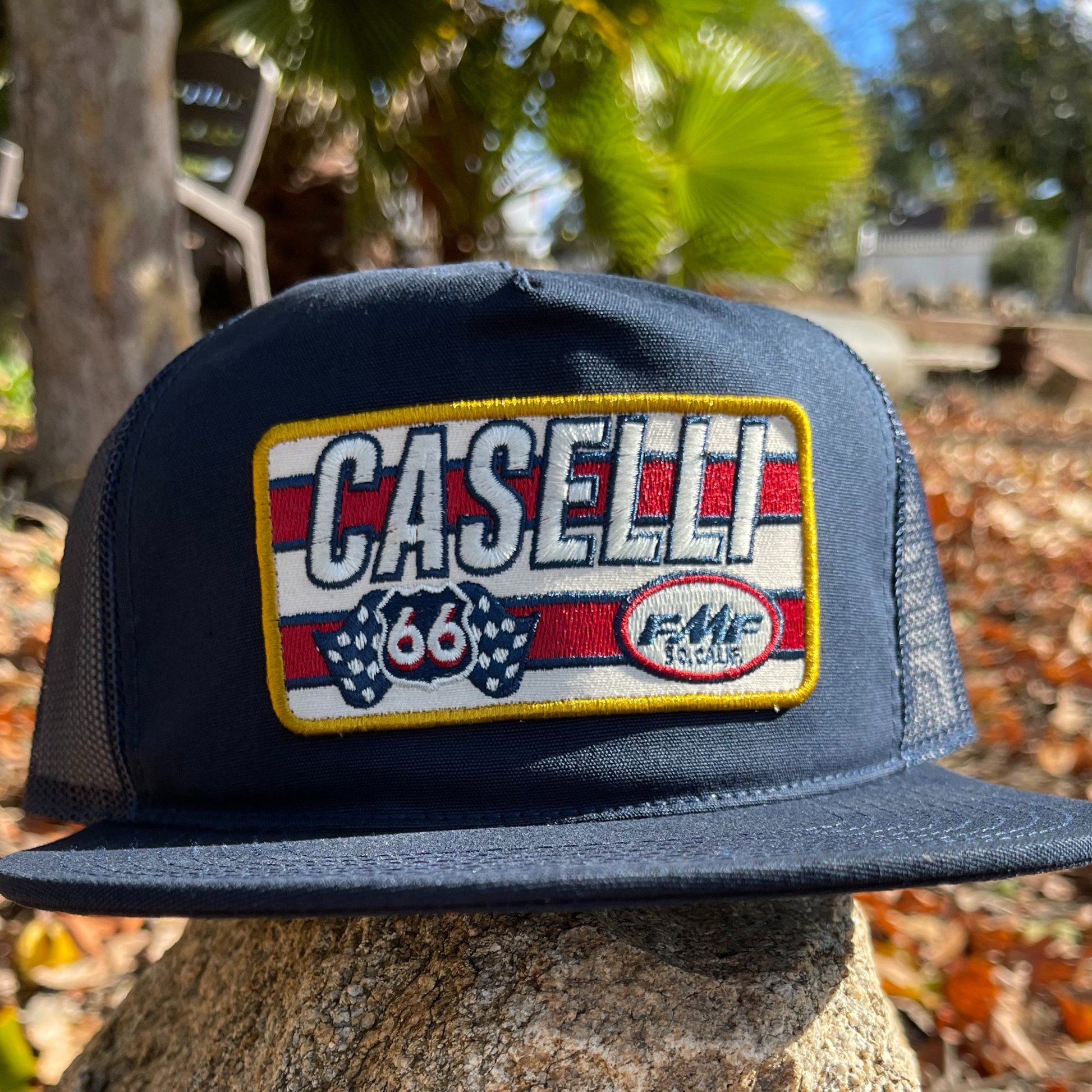 Stay stylish and pay tribute to Kurt Caselli with this STRIPES 66 SNAPBACK HAT. Featuring a navy snapback cap with an embroidered CASELLI patch, a checkered flag shield logo, and the FMF Racing logo, this hat will show your appreciation for the legendary racer. The patch border matches Kurt Caselli's signature on the underside of the flat bill, while the rear of the hat is made from mesh for a traditional trucker style.