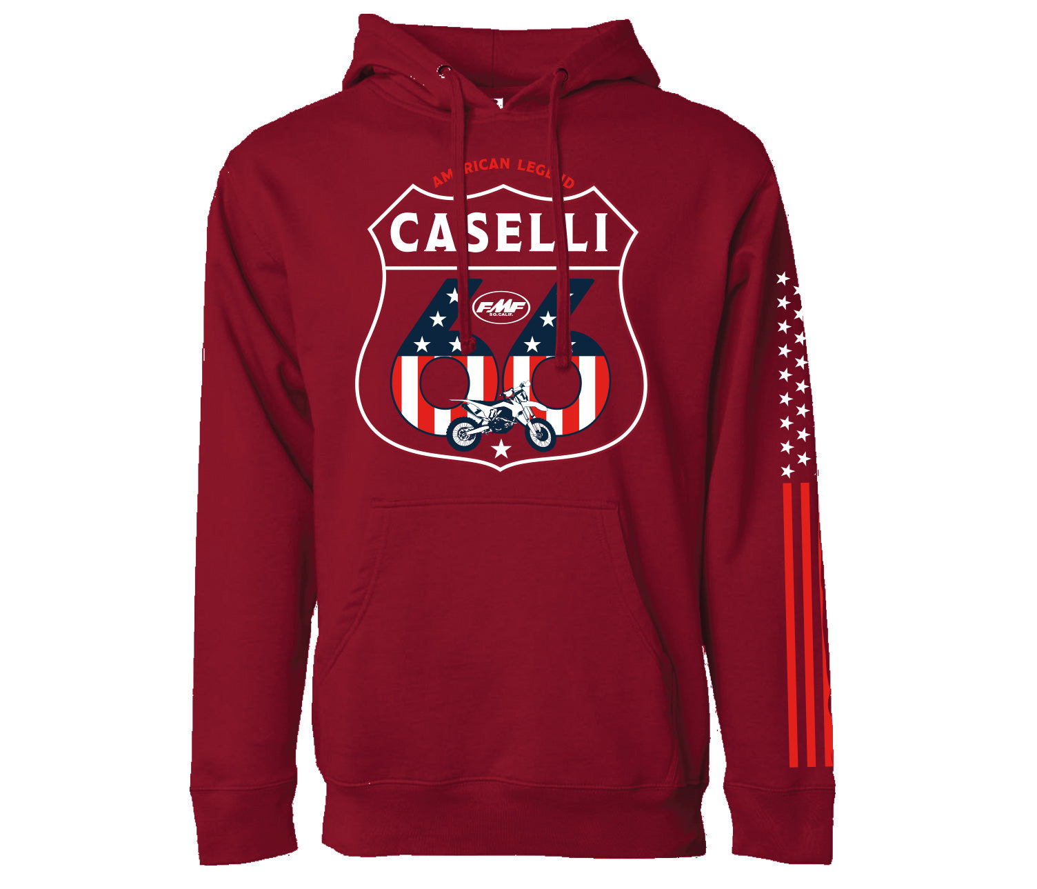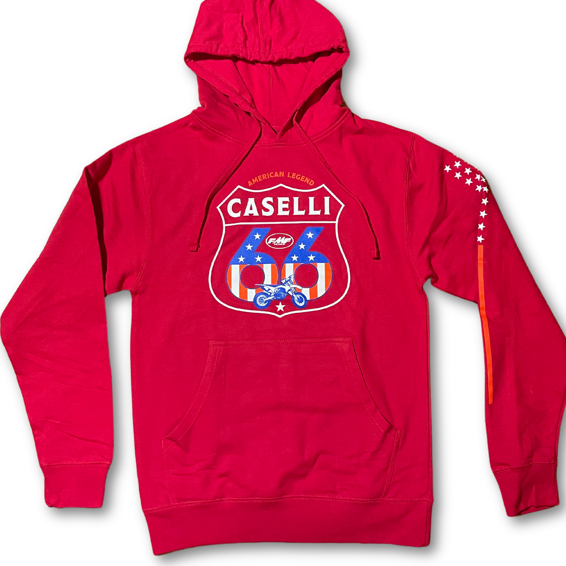 This red Worldwide Pullover Hoody is made of 100% cotton fleece, ensuring a soft and comfortable fit. It features a red, white & blue Caselli 66 print and is perfect for cool weather.